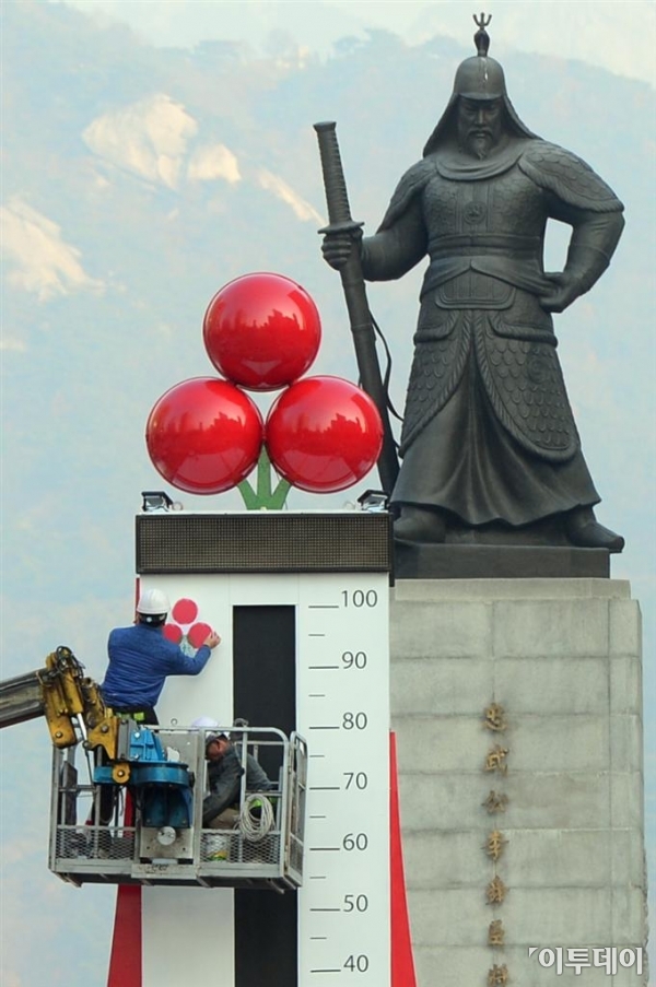 사랑의 열매 사회복지공동모금회가 20일부터 연말연시 이웃돕기 범국민 모금을 위한 ‘희망 2015 나눔캠페인’을 시작한다. 내년 1월 31일까지 73일 동안 진행되는 이번 캠페인은 전국 17개 시도지회에서 일제히 실시된다. 20일 오전 관계자들이 서울 광화문광장에서 사랑의 온도탑 준비작업을 마무리 하고 있다. 노진환 기자 myfixer@