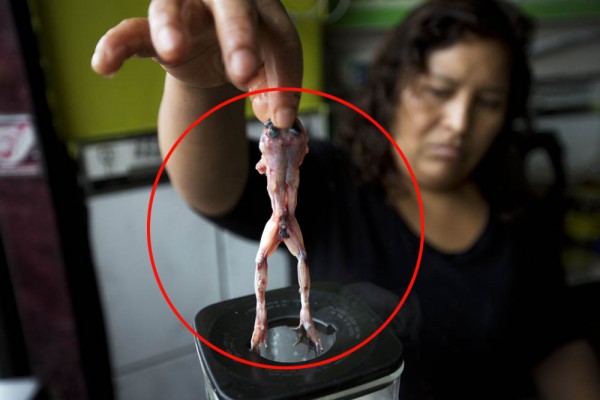 페루에서 멸종위기에 처한 개구리로 만든 주스가 성불감증 등 만병통치약으로 팔리고 있어 논란이 되고 있다. 지난 18일(현지시간) AP통신은 이런 개구리 주스가 효능이 있는 것인지 과학적으로 확인되지 않았지만 길거리에서 판매되고 있고, 일부 주민이 애용하는 음료가 됐다고 전했다. 리마에서 음료수 가게를 운영하는 한 상인이 주스를 제조하면서 개구리를 믹서기에 넣는 모습.
