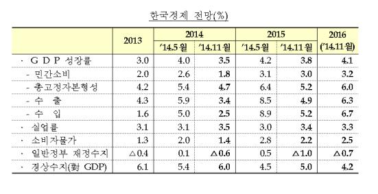 경제협력개발기구(OECD)가 내년 우리나라 경제성장률 전망치를 기존 4.2%에서 3.8%로 하향 조정했다. 올해 성장률도 기존보다 낮춰 3.5%로 전망했다. 2016년 성장률은 4.1%로 예상했다.