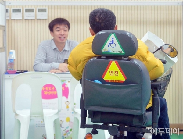 일자리를 찾는 장애인이 25일 서울 청운효자동 종로장애인복지관에서 열린 ‘2014 종로구 장애인 취업박람회’를 찾아 전동휠체어에 오른 채 취업상담을 하고 있다. 올해로 3회째인 이번 박람회는 취업에 어려움을 겪는 지역의 장애인에게 구직 기회를 제공하고, 기업에게는 필요한 인력을 제공해주기 위해 마련됐으며 전문가를 통한 취업·진로 상담과 이력서 작성 지원도 이뤄진다. 신태현 기자 holjjak@