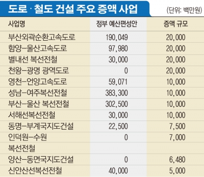 새로 건설되는 도로나 철도 중에서도 증액 규모가 큰 사업은 △부산외곽순환고속도로 △함양-울산고속도로 △별내선복선전철 △천왕-광명광역도로 등으로 각각 200억원씩 증액됐다. 이어 △영천-언양고속도로 △성남-여주복선전철 △부산-울산복선전철 △서해선복선전철 등이 각각 100억원씩 늘어났다.