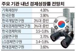 4일 금융권에 따르면 국내 주요 경제연구원들은 내년 성장률을 기획재정부(4.0%)와 한은(3.9%) 전망치보다 낮은 3%대 중후반으로 예측했다. △한국개발연구원 3%대 중반 △대외경제정책연구원 3%대 중반 △한국경제학회 3.5~3.8% △LG경제연구원 3.4~3.8% △현대경제연구원 3.6% 등이다. 정부와 한은의 기대와 달리 내년에도 올해 성장률 전망치 3.5%와 별반 다르지 않다.