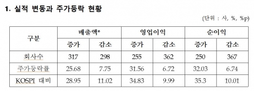 이에 비해 매출액, 영업이익, 순이익 감소사는 각각 11.02%포인트, 9.99%포인트, 10.01%포인트 증가해 상대적으로 낮은 수익률을 나타냈다.
