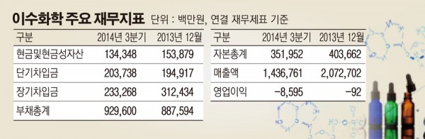 이에 이수화학은 이수건설의 유상증자에 참여해 500억원을 지원하는 등 자금을 투입해왔다. 이수건설에 대한 지원으로 현금 유동성이 떨어진 이수화학은 지난 7월 자회사인 이수앱지스 주식을 유동화하는 방식으로 교환사채(EB)를 발행해 150억원을 조달하는 등 자금 마련에 나섰지만 재무구조는 부실해진 모습이다. 3분기말 이수화학의 부채는 9296억원으로 작년 말에 8875에 비해 증가했지만 현금성 자산은 1538억원에서 1343억원으로 줄었다.