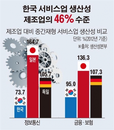 우리나라 서비스업의 노동생산성이 제조업의 46% 수준에 불과하고 정보통신·금융보험업 같은 중간재형 서비스업의 생산성은 경제협력개발기구(OECD) 회원국 중 최하위권인 것으로 나타났다.