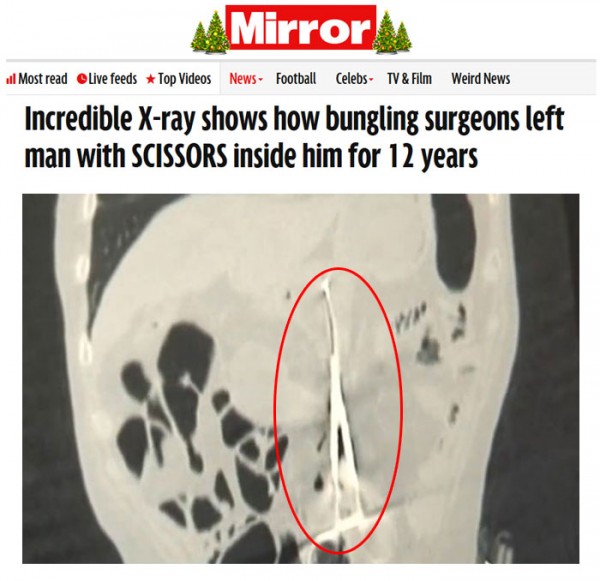 한 남성이 뱃속에 12년간 가위를 품고 지낸 사실을 뒤늦게 알게됐다고 최근 영국 미러가 보도했다. 보도한 내용에 따르면 카자흐스탄에 사는 카프 포노마료프(53)는 12년 전 현지 병원에서 수술을 받은 뒤 음식을 먹을때 마다 복통을 느꼈다. 체중이 줄고 식욕도 잃은 그는 다시 병원을 찾았고 충격적인 사실을 알게 됐다. 바로 12년 전 수술 당시 의료진이 뱃속에 의료용 가위를 넣고 봉합했던 것. 카프는 곧 가위를 꺼내는 수술을 받을 예정이며, 당시 의료진을 상대로 손해배상 소송 등을 제기할 생각은 없는 것으로 알려졌다.
