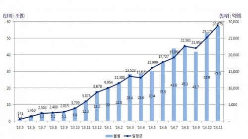 한국예탁결제원은 16일 기준 전기단기사채 총 발행금액이 501조3812억원을 기록했다고 17일 밝혔다. 이는 같은 기간 발행된 기업어음 804조5846억원의 약 62.3% 수준이다. 이달 기준 일평균 발행금액은 3조 651억원으로 발행이 본격적으로 시작된 지난해 5월 571억 보다 53.7배 급증했다.