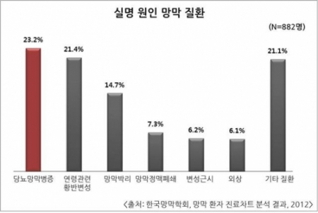 한국망막학회가 분석한 결과에 따르면, 실명을 유발할 수 있어 특히 주의해야 할 주요 망막질환이 연령대별로 다른 것으로 나타났다. 10~20대는 망막박리, 30~40대 당뇨환자는 당뇨망막병증, 50대는 망막정맥폐쇄, 60대 이상은 황반변성을 중점적으로 관리해야 하는 것으로 조사됐다.