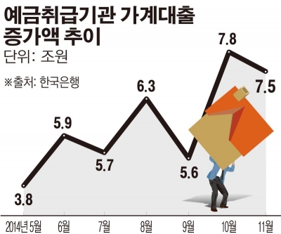 한국은행이 13일 발표한 ‘예금취급기관 가계대출’ 자료에 따르면 작년 11월말 현재 예금은행과 비은행예금취급기관(저축은행·신용협동조합·새마을금고·상호금융 등)의 가계대출 잔액은 총 738조2000억원으로 전달에 비해 7조5000억원 늘었다.