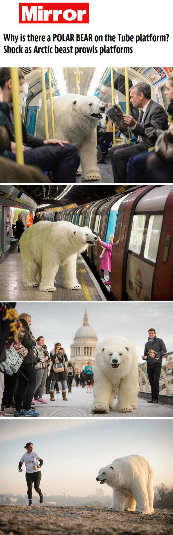 27일(현지시간) 영국 미러는 런던 시내에 북극곰이 출몰한 사연을 전했다. 보도에 따르면 2m40cm 길이의 이 북극곰은 TV채널인 스카이 어틀랜틱(sky atlantic)의 신작 드라마 ‘포티튜드(Fortitude)’ 론칭에 맞춰 제작된 가짜 곰이다. ‘포티튜드’는 북극의 마을을 배경으로 한 영국 과학자들의 이야기로 약 3000마리의 북극곰이 등장한다. 매우 정교한 기술로 제작된 이 곰은 내부에 카메라가 숨겨져 있고, 카메라를 통해 전송된 영상을 보며 두 명의 전문가가 곰의 동작을 조종한다. 전문가가 조종하는 이 북극곰은 드라마 론칭 이벤트로 런던 시내 곳곳을 돌아다닌 것. 스카이 어틀랜틱의 책임자인 자이 베넷은 “사람들에게 북극곰을 더욱 가깝게 경험시키고 싶었다”고 전했다.