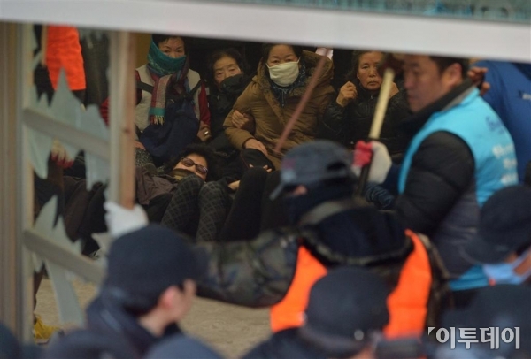 서울 강남구청이 6일 오전 개포동 구룡마을 주민자치회관에 대한 행정대집행에 들어갔으나 법원의 잠정중단 결정에 2시간여 만에 중지됐다. 구청 관계자가 출입구를 부수려하자 주민들이 이를 지켜보고 있다. 신태현 기자 holjjak@