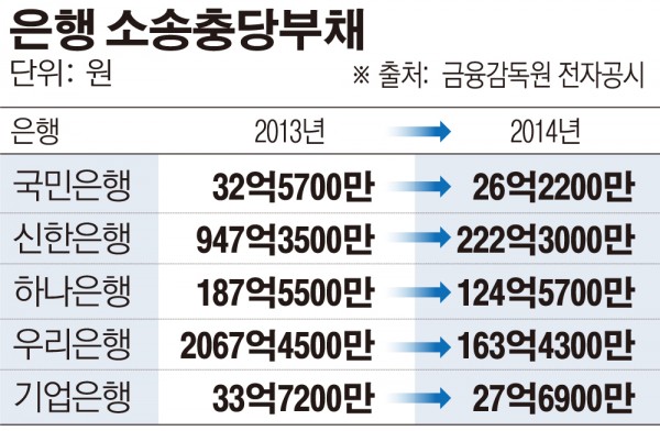 지난해 은행들의 소송 리스크가 큰 폭으로 줄었습니다. KB국민, 신한, 하나, 우리, 기업은행 등 5개 주요 은행의 소송충당부채는 564억2100만원으로 전년대비 82% 줄었습니다. 각종 금융사고에 리스크 관리를 강화한데 따른 결과라고는 하는데 일각에서는 은행들이 소송에 패소했을 경우 재무적 준비가 충분치 않다고 지적하고 있습니다.