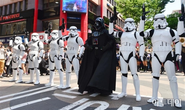 ‘스타워즈 데이’인 4일 서울 명동 일대에서 영화 스타워즈의 다스 베이더와 스톰 트루퍼 캐릭터 등이 마칭 밴드와 함께 퍼레이드를 하고있다. ‘스타워즈 데이’는 영화 속 대사 ‘포스가 당신과 함께 하기를’(May the Force be with you)의 영어 표현이 5월 4일(May the Fourth)와 비슷하게 들리는 데에서 유래했다. 신태현 기자 holjjak@