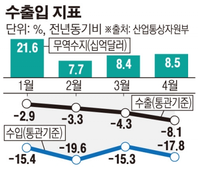 실제로 올 들어 전년동기대비 수출은 통관기준으로 1월 -2.9%, 2월 -3.3%, 3월 -4.3%, 4월 -8.1%로 감소폭을 확대하고 있다.