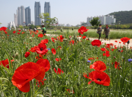 ▲이번 주말은 대체로 맑아 외출하기에 좋은 날씨가 이어질 것으로 관측됐다. 사진은 최근 울산 태화강대공원 초화단지에서 나들이 나온 시민들이 봄꽃을 구경하고 있는 모습.(사진=연합뉴스)