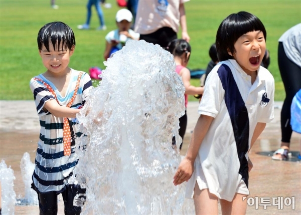서울 낮 기온이 29도를 기록하고 경상도 곳곳에 첫 폭염주의보가 내려지는 등 올 들어 가장 더운 날씨를 보인 25일 서울 태평로 서울광장 앞에 설치된 분수에서 어린이들이 물놀이를 하며 즐거운 시간을 보내고 있다. 신태현 기자 holjjak@