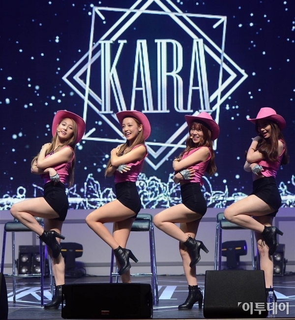그룹 카라가 26일 오후 한남동 블루스퀘어에서 진행된 카라 7번째 미니앨범 ‘인 러브(In Love)’ 발매기념 쇼케이스에서 안무를 선보이고 있다.