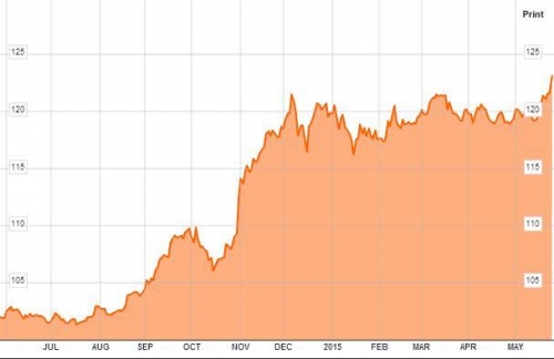도쿄외환시장에서 28일(현지시간) 달러ㆍ엔 환율은 장중 124.30엔으로 지난 2002년 12월 이후 12년 6개월 만에 최고치(엔화 가치 최저치)를 찍었다. 달러ㆍ엔 환율은 이후 상승폭이 줄었지만 오후 2시 현재 전일 대비 0.37% 오른 124.12엔으로, 여전히 124엔 선을 고수하고 있다.