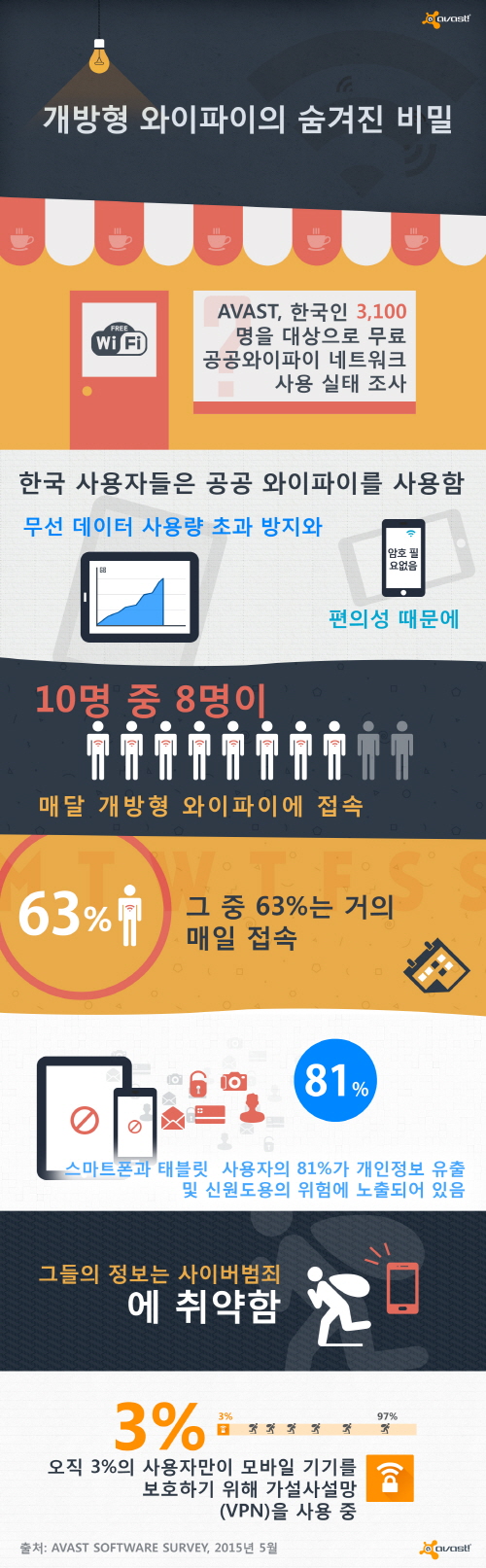 특히 어베스트 소프트웨어는 지난달 국내 사용자 3100명을 대상으로 ‘무료 와이파이 사용 시의 보안 위험’에 설문조사를 실시했다. 조사 결과 국내 스마트폰과 태블릿 사용자의 81%가 공공 와이파이 네트워크를 사용하며 개인정보 유출의 위험에 노출돼 있는 것으로 나타났다. 어베스트는 많은 사용자들이 비밀번호를 입력하는 단계를 번거롭게 느껴 개방형 와이파이를 선호하는 것으로 분석했다. 특히 이 중 50% 가량은 모바일 기기의 와이파이 기능을 끄지 않고 생활하기 때문에 악의를 가지고 네트워크를 연결한다면 개인정보가 유출될 수 있는 가능성이 높다.