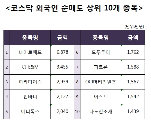 3일 코스닥 외국인 순매도 상위 10개 종목