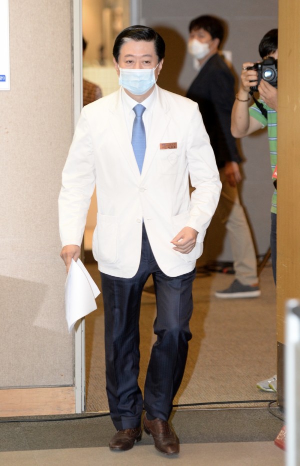 송재훈 삼성서울병원장이 7일 오전 서울 강남구 삼성서울병원 중강당에서 열린 메르스 관련 현황과 대책 등 공식 입장 기자회견에 마스크를 쓰고 들어서고 있다.