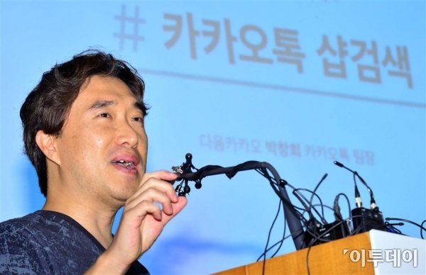 박창희 다음카카오 카카오톡 팀장이 30일 서울 중림동 LW컨벤션에서 열린 다음카카오 프레스톡에 참석해 '카카오톡 샵검색:카톡하다 궁금하면? 샵검색'을 주제로 발표하고 있다. 신태현 기자 holjjak@