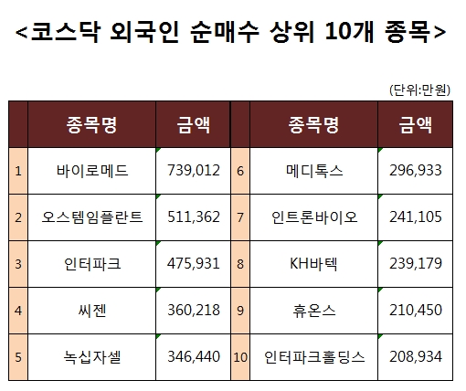 [코스닥 외국인 순매수 상위 10개 종목]
