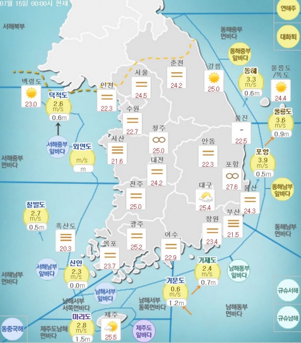 같은 날 오전 0시 기준 현재 기온은 서울 24.5도, 인천 22.3도, 춘천 24.2도, 강릉 25.0도, 수원 22.7도, 청주 25.0도, 서산 21.6도, 대전 24.2도 안동 22.3도, 울진 22.5도, 울릉도 24.4도, 전주 25.0도, 대구 25.4도, 포항 27.6도, 광주 25.2도, 목포 23.7도, 여수 22.9도, 창원 23.4도, 부산 21.5도, 울산 24.3도, 제주 25.5도다