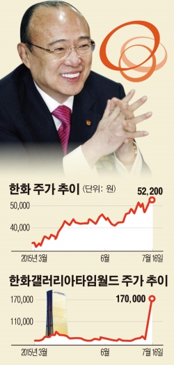 이 기간 시가총액도 껑충 뛰어 9일 3600억원이었던 시총 규모는 1조2000억원까지 수직 상승했다. 그룹 지주회사 격인 한화의 주가도 이 기간 10.45% 올랐다. 김 회장의 주식가치가 늘어난 데는 한화그룹의 지주회사인 한화의 주가가 올랐기 때문이다. 한화와 한화갤러리아타임월드는 한화-한화케미칼-한화갤러리아-한화갤러리아타임월드의 순서로 지분이 연결돼 있다.
