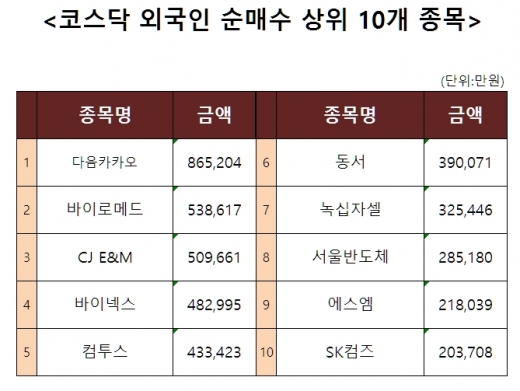 [코스닥 외국인 순매수 상위 10개 종목]
