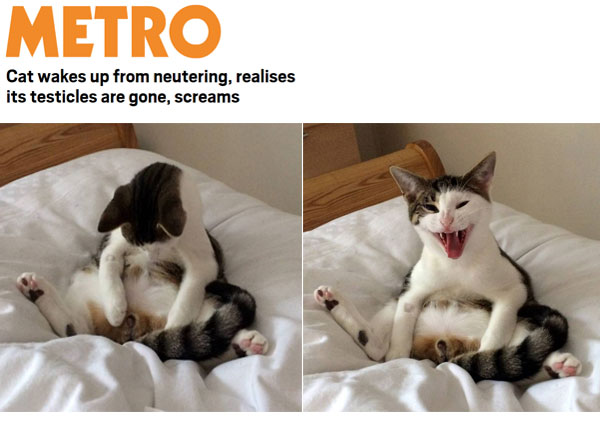중성화 수술을 받은 수컷 고양이가 자신의 '남성'이 사라진 사실을 알고 비명(?)을 지르는 사진을 22일(현지시간) 메트로가 공개했다. 잉글린드 컴브리아주 프리징턴에 거주하는 50대 남성은 자신의 수컷 고양이 마일로를 지역 동물병원에서 중성화 수술을 시켰다. 수술 이후 침대에서 잠을 깬 마일로는 어리둥절한 표정으로 자신의 아랫도리를 바라보다 큰 울음소리를 냈다고 전해졌다. 주인은 그 모습이 너무나 안타깝지만 동시에 웃음이 터져나왔다고 말했다.