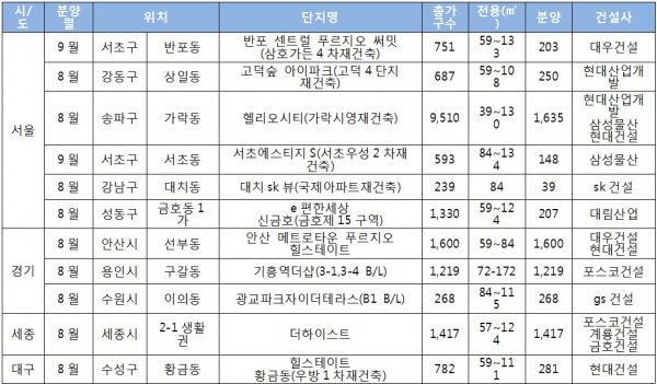 우선 서울에서는 입지여건이 좋은 곳에 위치한 ‘반포 센트럴 푸르지오 써밋(삼호가든4차 재건축)’, ‘고덕숲 아이파크(고덕주공4단지 재건축)’ 등 강남권 재건축 아파트가 분양될 예정이다. 수도권에서는 1000가구 이상을 분양하는 ‘안산 메트로타운 푸르지오 힐스테이트’가 눈길을 끈다. 상반기 분양시장을 달궜던 세종과 대구에서도 각각 ‘더하이스트’, ‘힐스테이트 황금동(우방1차 재건축)을 선보인다.