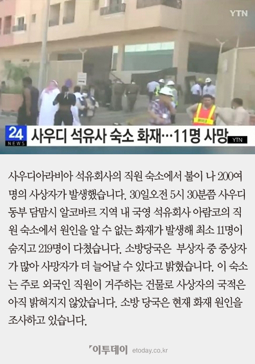 [짤막카드] 사우디 석유회사 숙소서 화재, 11명 사망·219명 부상… 사상자 국적 파악 안돼