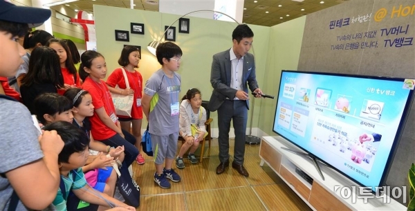 ‘제2회 대한민국 금융대전’이 31일 서울 삼성동 코엑스에서 열린 가운데 행사장을 찾은 어린이들이 신한tv뱅크에 대한 설명을 듣고있다. 프리미엄 경제신문 이투데이가 주최한 이번 박람회에선 17개 은행, 정책금융기관, 벤처캐피탈 등 전 금융회사가 참여해 투자처를 마련하지 못해 창업을 미루고 있는 예비창업자와 우수하고 참신한 기술력과 노하우를 지니고 있지만 자금조달에 어려움을 겪어온 중소기업에 금융지원 활로를 제공한다. 신태현 기자 holjjak@