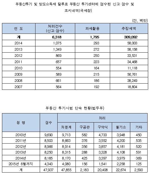 3일 국회 국토교통위원회 김태원 의원(새누리당, 경기 고양덕양을)이 국세청으로부터 제출받은 자료에 따르면 2007년~2013년까지 부동산 투기 및 양도소득세 탈루로 부동산 투기신고센터에 접수된 신고건수는 총 6,318건으로 조사됐다. 국세청은 이중 1,795건(28.4%)을 과세로 활용해 3,090억원을 추징 고지했다.