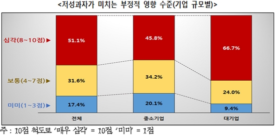 전체 근로자 가운데 저성과자 비중은 중소기업보다 대기업에서 높게 나타났다. 대기업은 저성과자 비중이 ‘5~10%’라는 응답이 45.4%, ‘10~15%’가 23.5%로 나타난 반면 중소기업은 ‘5% 미만’이 59.8%, ‘5~10%’가 25.4%로 조사됐다.