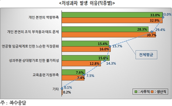 기업은 저성과자가 발생하는 주된 이유로 ‘개인 본연의 역량 부족’(33.0%)을 가장 많이 꼽았고, 이외에 ‘조직 부적응과 태도문제’(29.4%), ‘연공형 임금체계로 인한 느슨한 직장문화’(15.7%) 순으로 나타났다. 또한 저성과자의 근속연수가 길다고 응답한 기업일수록 ‘연공형 임금체계로 인한 느슨한 조직문화’가 저성과자 발생 이유라고 응답한 비율이 높게 나타났다.