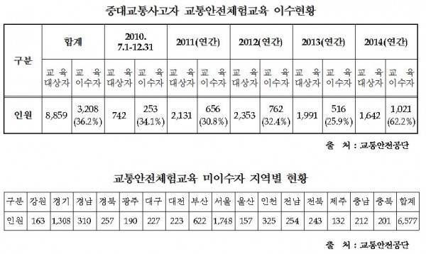 16일 교통안전공단이 국회 국토교통위원회 소속 새누리당 김태원 의원(경기 고양 덕양을)에게 제출한 자료에 따르면 중대교통사고자 교통안전체험교육이 의무화된 2010년 7월부터 지난해까지 교육 미이수자는 전체 교육대상자 8,859명 중 63.8%인 5,651명에 달했다.
