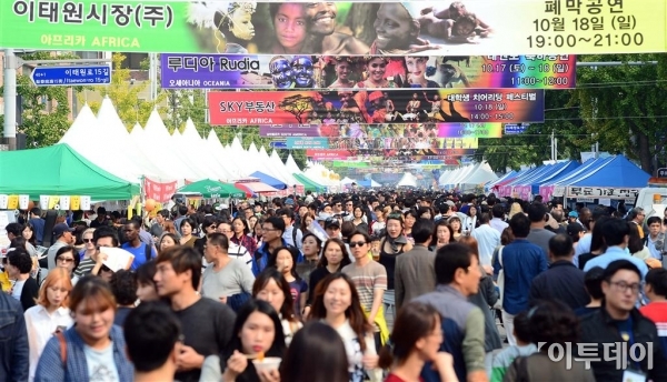 ‘2015 이태원 지구촌 축제’가 18일 서울 이태원동 일대에서 열린 가운데 이태원대로가 참관객들로 붐비고 있다. 세계 각국의 관광객들이 함께한 이태원 지구촌 축제에선 세계 민속의상 패션쇼와 전통혼례, 도심 속 과거시험 재현 행사 등 다양한 볼거리와 세계음식문화체험거리를 비롯한 먹거리, 즐길거리가 마련됐다. 신태현 기자 holjjak@