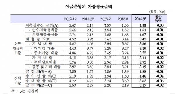 한국은행이 29일 발표한 ‘9월 중 금융기관 가중평균금리’에 따르면 지난달(이하 신규취급액 기준) 저축성 수신 평균 금리는 전월과 같은 연 1.55%로 집계됐다. 이는 한은이 관련 조사를 시작한 1996년 이래 가장 낮은 수치다.