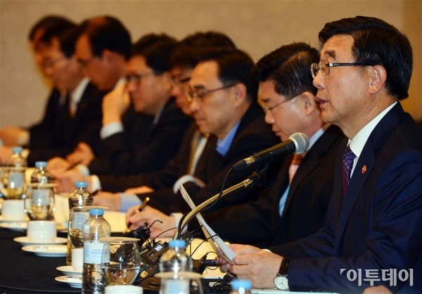 이기권 고용노동부 장관이 4일 서울 도화동 가든호텔에서 열린 ‘30대 그룹 최고인사책임자(CHO) 청년고용 간담회’에 참석해 모두발언을 하고 있다. 이 자리에서 이 장관은 국내 30대그룹 CHO들과 함께 ‘청년 일자리 기회 20만+ 프로젝트’의 이행 및 ‘청년 일자리 창출을 위한 노동개혁’의 추진상황 등을 점검하고 향후 협력방안을 논의했다. 신태현 기자 holjjak@
