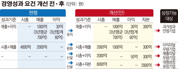 먼저 경영성과요건을 △시가총액 2000억원 이상+이익 50억원 이상 또는 △시총 6000억원 이상+자본 2000억원 이상인 기업도 상장 가능하도록 개선한다.