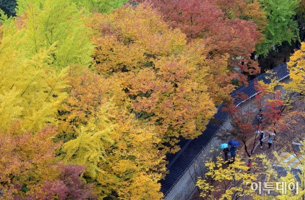 겨울이 시작된다는 절기상 입동(立冬)인 8일 오전 가을비가 촉촉이 내리고 있는 가운데 서울 중구 덕수궁 돌담길을 찾은 시민들이 산책을 하며 떠나는 가을의 정취를 느끼고 있다. 노진환 기자 myfixer@