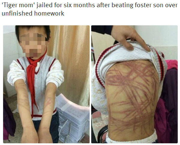 숙제를 안 했다는 이유로 9살 아들을 학대한 양어머니가 징역 6개월을 선고 받았다고 21일(현지시간) 상하이스트가 보도했다. 6살 때 입양된 이 소년은 양어머니에게 지속적으로 학대를 당해왔으며, 이 사실을 알게 된 학교 선생님이 SNS에 사진을 올리면서 사건이 드러났다. 경찰 조사 결과 양어머니는 지난 3년 동안 아들이 말을 안 듣지 않고 숙제를 하지 않는다는 이유로 학대를 일삼은 것으로 알려졌다. 법원은 양어머니의 폭행 사실을 인정하면서도 자수했다는 점을 감안해 징역 6개월을 선고했다.