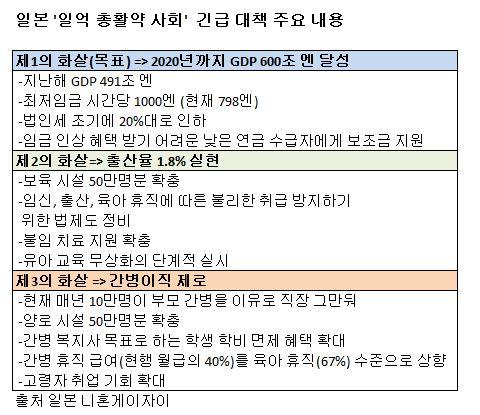 마이너스 성장에 허덕이는 일본이 특단의 대책을 내놨다. 일본 정부는 26일(현지시간) 아베 신조 총리가 내건 ‘일억 총활약 사회’ 실현을 위한 긴급 대책을 내놓았다고 니혼게이자이신문이 보도했다. ‘일억 총활약 사회’는 고령화 시대를 맞아 일본 인구 전체가 활약한다는 의미로 아베 총리가 제시한 핵심 슬로건이다.