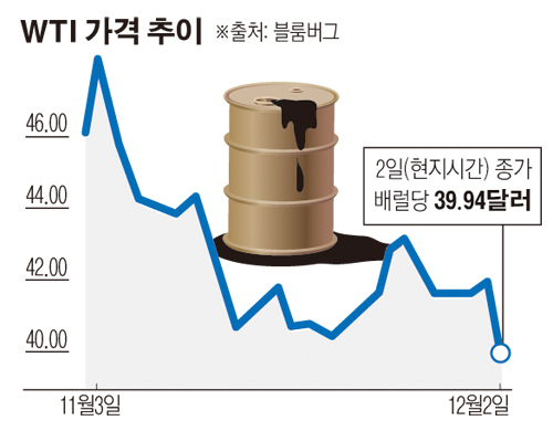 국제유가가 2일(현지시간) 큰 폭으로 떨어지며 40달러선이 붕괴됐습니다. 원유시장의 공급 과잉 현상이 지속되는 가운데 4일 열릴 석유수출국기구(OPEC) 총회에서도 감산 결의가 나오기 힘들 것이란 전망이 유가를 짓누르고 있습니다. OPEC의 맹주인 사우디아라비아의 산유량 동결 고집에 일부 회원국이 반기를 들면서 50여년간 지속돼온 석유 카르텔이 깨질 가능성도 배제할 수 없는 상황입니다.