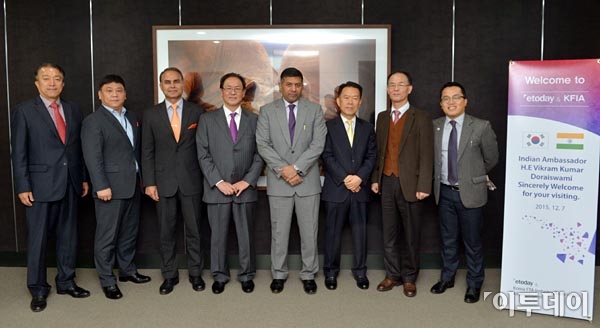 이종재 이투데이 대표이사(왼쪽에서 네번째), 비크람 쿠마르 도래스와미 주한 인도대사(왼쪽에서 다섯번째), 이창우 (사)한국FTA산업협회장(왼쪽에서 여섯번째) 등이 7일 오전 서울 동작구 이투데이 사옥에서 미팅을 마친 후 기념촬영을 하고 있다. 최유진 기자 strongman55@