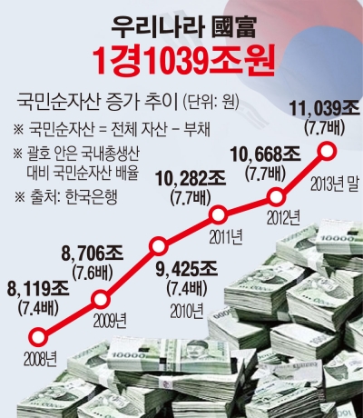한국은행과 통계청이 발표한 자료에 따르면 우리나라 국민 순자산은 2008년 말 8118조5000억원에서 2013년 말 1경1039조2000억원으로 5년 동안 36%(2920조7000억원) 증가했습니다.