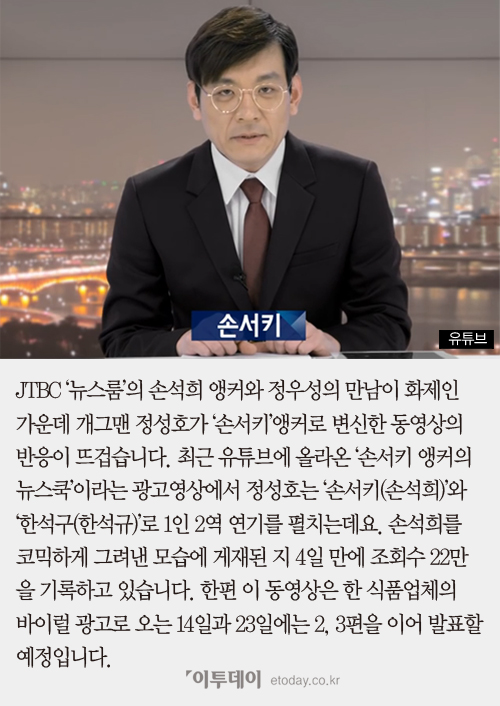 JTBC '뉴스룸'의 손석희 앵커와 정우성의 만남이 화제인 가운데 개그맨 정성호가 '손서키'앵커로 변신한 동영상의 반응이 뜨겁습니다. 최근 유튜브에 올라온 '손서키 앵커의 뉴스쿡'이라는 광고영상에서 정성호는 '손서키(손석희)'와 '한석구(한석규)'로 1인 2역 연기를 펼치는데요. 손석희를 코믹하게 그려낸 모습에 게재된 지 4일 만에 조회수 22만을 기록하고 있습니다. 한편 이 동영상은 한 식품업체의 바이럴 광고로 오는 14일과 23일에는 2, 3편을 이어 발표할 예정입니다.
