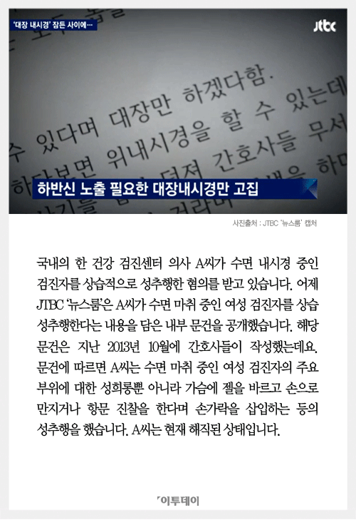 국내의 한 건강 검진센터 의사 A씨가 수면 내시경 중인 검진자를 상습적으로 성추행한 혐의를 받고 있습니다. 어제 JTBC ‘뉴스룸’은 A씨가 수면 마취 중인 여성 검진자를 상습 성추행한다는 내용을 담은 내부 문건을 공개했습니다. 해당 문건은 지난 2013년 10월에 간호사들이 작성했는데요. 문건에 따르면 A씨는 수면 마취 중인 여성 검진자의 주요 부위에 대한 성희롱뿐 아니라 가슴에 젤을 바르고 손으로 만지거나 항문 진찰을 한다며 손가락을 삽입하는 등의 성추행을 했습니다. A씨는 현재 해직된 상태입니다.